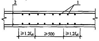 图 7.2.20 剪力墙分布钢筋的搭接连接 1—竖向分布钢筋;2—水平分布钢筋;非抗震设计时图中 laE 取 la 3 暗柱及端柱内纵向钢筋连接和锚固要求宜与框架柱相同,宜符合本规程第 6.5 节的有关规定。 7.2.21 连梁两端截面的剪力设计值V应按下列规定确定: 1 非抗震设计以及四级剪力墙的连梁,应分别取考虑水平风荷载、水平地震作用组合的剪力设计值。 2 一、二、三级剪力墙的连梁,其梁端截面组合的剪力设计值应按式(7.2.21-1)确定,9 度时一级剪力墙的连梁应按式(7.2.21-2)确定。