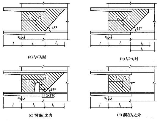 图 7.4.4 挑梁下砌体局部受压 7.4.5 挑梁的最大弯矩设计值 Mmax 与最大剪力设计值 Vmax,可按下列公式计算: Mmax=M0 (7.4.5-1) Vmax=V0 (7.4.5-2) 式中:M0——挑梁的荷载设计值对计算倾覆点截面产生的弯矩; V0——挑梁的荷载设计值在挑梁墙外边缘处截面产生的剪力。 7.4.6 挑梁设计除应符合现行国家标准《混凝土结构设计规范》GB50010 的有关规定外,尚应满足下列要求: 1 纵向受力钢筋至少应有 1/2 的钢筋面积伸入梁尾端,且不少于 2φ12。其余钢筋伸入支座的长度不应小于 2l1/3; 2 挑梁埋入砌体长度 l1 与挑出长度 l 之比宜大于 1.2;当挑梁上无砌体时,l1 与 l 之比宜大于 2。 7.4.7 雨篷等悬挑构件可按第 7.4.1 条~7.4.3 条进行抗倾覆验算,其抗倾覆荷载 Gr 可按图 7.4.7 采用,Gr 距墙外边缘的距离为墙厚的 1/2,l3 为门窗洞口净跨的 1/2。