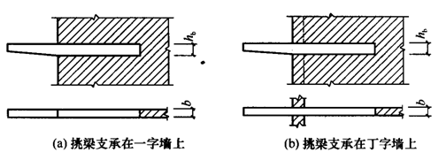 图 7.4.3 挑梁的抗倾覆荷载 7.4.4 挑梁下砌体的局部受压承载力,可按下式验算(图 7.4.4): Nl≤ηγfAl (7.4.4) 式中:Nl——挑梁下的支承压力,可取 Nl=2R,R 为挑梁的倾覆荷载设计值; η——梁端底面压应力图形的完整系数,可取 0.7; γ——砌体局部抗压强度提高系数,对图 7.4.4a 可取 1.25;对图 7.4.4b 可取 1.5; Al——挑梁下砌体局部受压面积,可取 Al=1.2bhb,b 为挑梁的截面宽度,hb 为挑梁的截面高度。