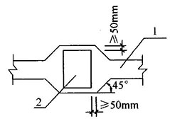 图 8.3.1 现浇柱与条形基础梁交接处平面尺寸 1—基础粱;2—柱 3 现浇柱与条形基础梁的交接处,基础梁的平面尺寸应大于柱的平面尺寸,且柱的边缘至基础梁边缘的距离不得小于 50mm(图8.3.1)。 4 条形基础粱顶部和底部的纵向受力钢筋除应满足计算要求外,顶部钢筋应按计算配筋全部贯通,底部通长钢筋不应少于底部受力钢筋截面总面积的 1/3。 5 柱下条形基础的混凝土强度等级,不应低于 C20。 8.3.2 柱下条形基础的计算,除应符合本规范第 8.2.6 条的要求外,尚应符合下列规定: 1 在比较均匀的地基上,上部结构刚度较好,荷载分布较均匀,且条形基础梁的高度不小于 1/6 柱距时,地基反力可按直线分布,条形基础梁的内力可按连续梁计算,此时边跨跨中弯矩及第一内支座的弯矩值宜乘以 1.2 的系数。 2 当不满足本条第 1 款的要求时,宜按弹性地基梁计算。 3 对交叉条形基础,交点上的柱荷载,可按静力平衡条件及变形协调条件.进行分配。其内力可按本条上述规定,分别进行计算。 4 应验算柱边缘处基础梁的受剪承载力。 5 当存在扭矩时,尚应作抗扭计算。 6 当条形基础的混凝土强度等级小于柱的混凝土强度等级时,应验算柱下条形基础梁顶面的局部受压承载力。