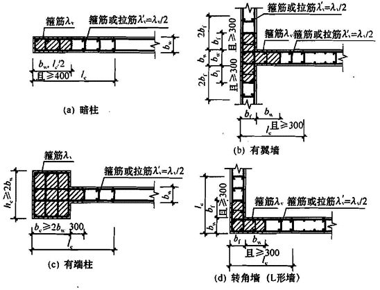 图 7.2.15 剪力墙的约束边缘构件 2 剪力墙约束边缘构件阴影部分(图 7.2.15)的竖向钢筋除应满足正截面受压(受拉)承载力计算要求外,其配筋率一、二、三级时分别不应小于 1.2%、1.0%和1.0%,并分别不应少于 8φ16、6φ16 和 6φ14 的钢筋(φ 表示钢筋直径); 3 约束边缘构件内箍筋或拉筋沿竖向的间距,一级不宜大于 100mm,二、三级不宜大于 150mm;箍筋、拉筋沿水平方向的肢距不宜大于 300mm,不应大于竖向钢筋间距的 2 倍。 7.2.16 剪力墙构造边缘构件的范围宜按图 7.2.16 中阴影部分采用,其最小配筋应满足表 7.2.16 的规定,并应符合下列规定: 1 竖向配筋应满足正截面受压(受拉)承载力的要求; 2 当端柱承受集中荷载时,其竖向钢筋、箍筋直径和间距应满足框架柱的相应要求; 3 箍筋、拉筋沿水平方向的肢距不宜大于 300mm,不应大于竖向钢筋间距的2倍; 4 抗震设计时,对于连体结构、错层结构以及 B 级高度高层建筑结构中的剪力墙(筒体),其构造边缘构件的最小配筋应符合下列要求: