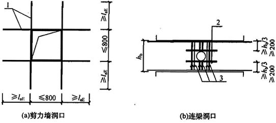 图 7.2.27 连梁配筋构造示意 注:非抗震设计时图中 laE 取 la。 7.2.28 剪力墙开小洞口和连梁开洞应符合下列规定: 1 剪力墙开有边长小于 800mm 的小洞口、且在结构整体计算中不考虑其影响时,应在洞口上、下和左、右配置补强钢筋,补强钢筋的直径不应小于 12mm,截面面积应分别不小于被截断的水平分布钢筋和竖向分布钢筋的面积(图 7.2.28a); 2 穿过连梁的管道宜预埋套管,洞口上、下的截面有效高度不宜小于梁高的 1/3,且不宜小于 200mm;被洞口削弱的截面应进行承载力验算,洞口处应配置补强纵向钢筋和箍筋(图 7.2.28b),补强纵向钢筋的直径不应小于 12mm。